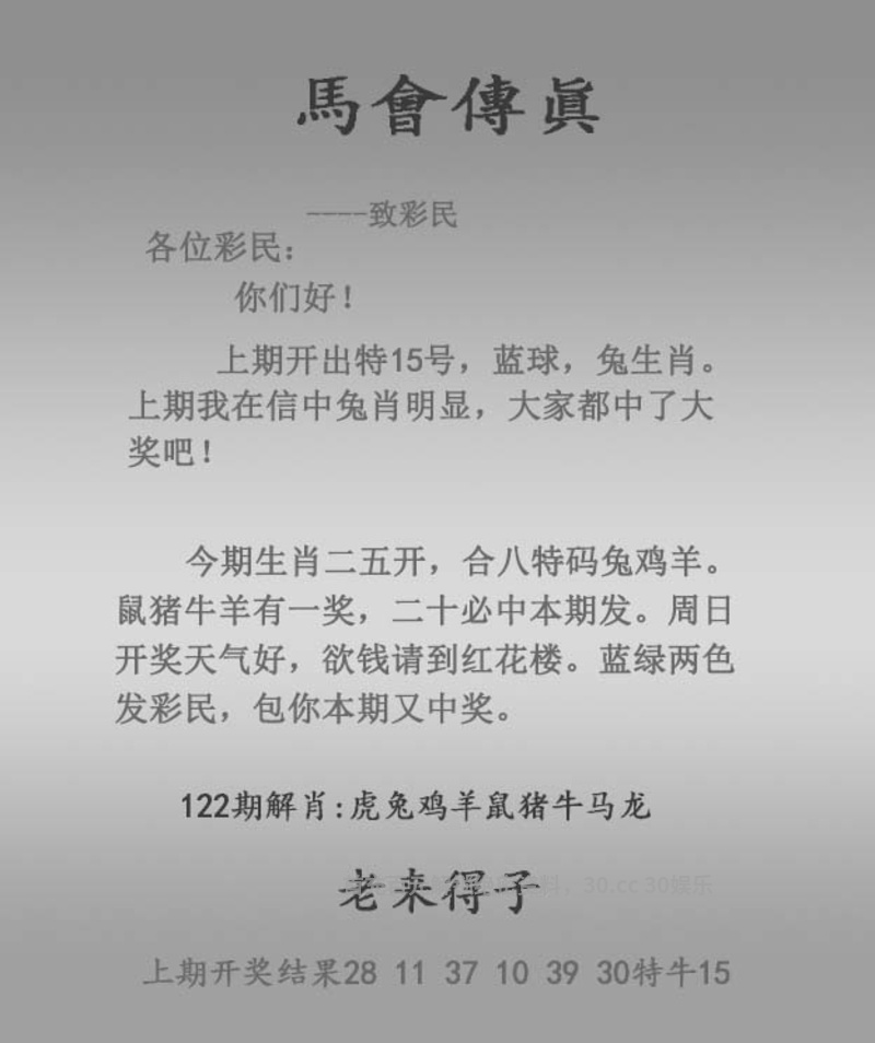 122期马会传真: 今期生肖二五开,合八特码兔鸡羊。鼠猪牛羊有一奖,二十必中本期发。周日开奖天气好,欲钱请到红花楼。蓝绿两色发彩民,包你本期又中奖。 老来得子 特围生肖:虎兔鸡羊鼠猪牛马龙 |